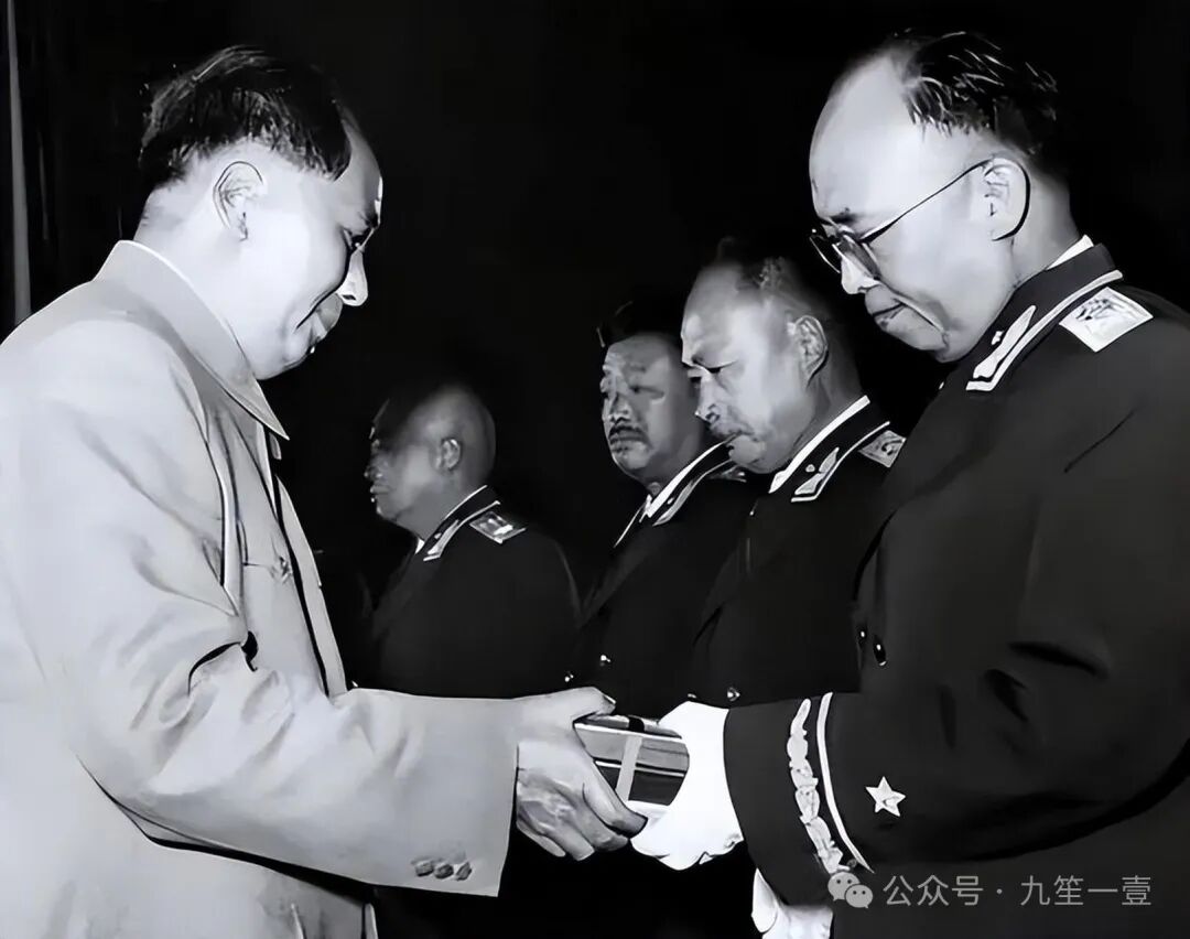 毛主席逐一走到每一位将领面前,庄重地为他们授予军衔和荣誉称号。