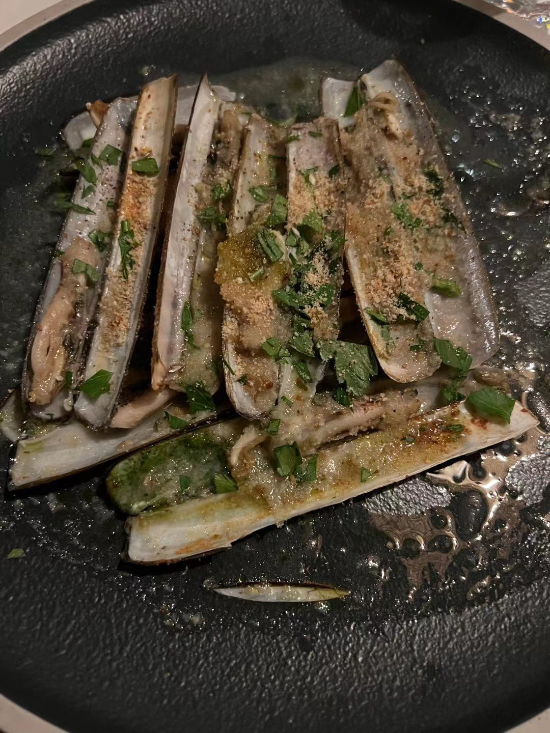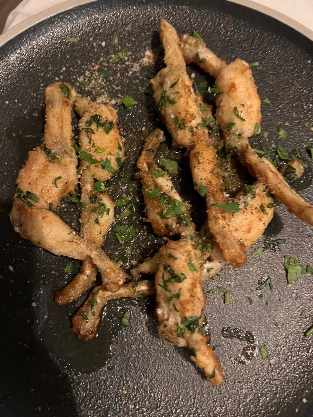拿出之前存的冰柜里的冷冻蛙腿、蛏子,裹点淀粉,加点蒜末、黄油煎一煎,最后撒点欧芹碎末,十分钟快手菜,比外卖好吃多了,幸亏当年留学在外,攒的简单做个饭,糊糊口的手艺还在。