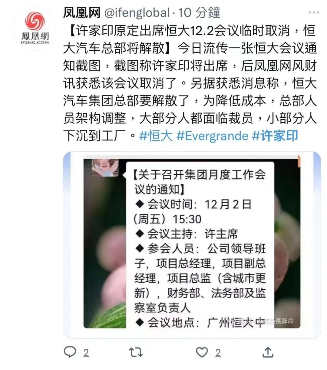 结果又从一个会议取消的截图发酵,说恒大这个会议取消,恒大解散了汽车总部,然后这个会议取消的事情和跳楼就混在了一起,迅速传播开了。