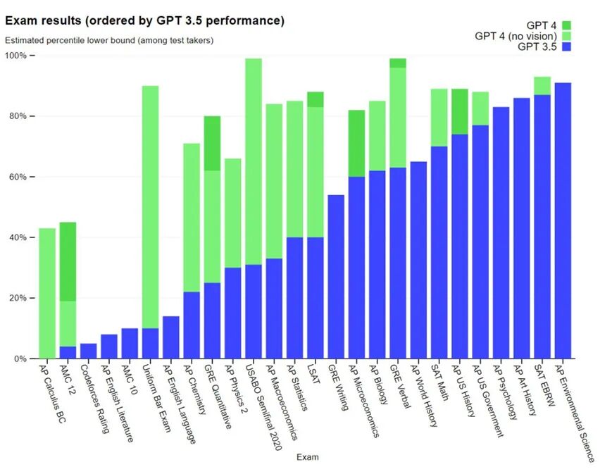 GPT-4在各种专业测试和学术基准上的表现与人类水平相当。SAT这种高中生考大学的自然不在话下,甚至高难度的考试,比如说,它通过了模拟律师考试,且分数在应试者的前10%左右;相比之下,老版本GPT-3.5的得分在倒数10%左右。这也说明了AI能达到的智慧高度。