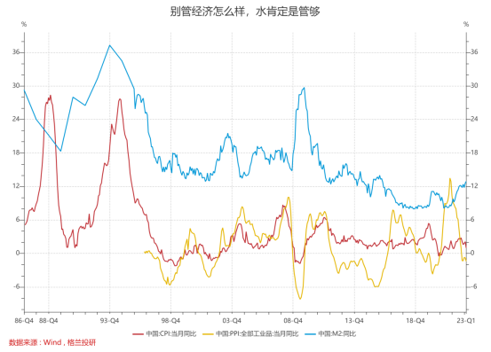 可以看到,CPI(消费者价格指数)、PPI(生产者物价指数),都起不来,但蓝线所代表的M2,也就是货币供应量,是非常足的,也就是说,水是管够的。