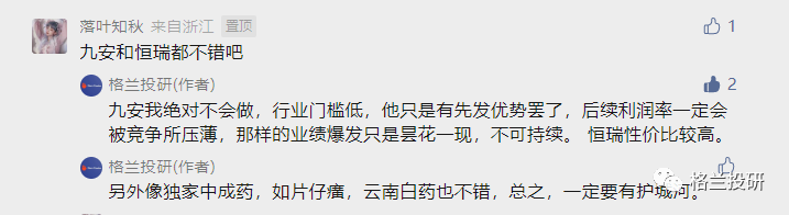 然后我在评论区里回答了很多医药板块的问题,主要看好恒瑞医药、片仔癀、云南白药,不看好九安医疗,中国医药。