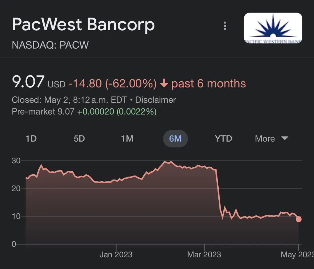 PacWest银行也算个挺像样的银行,饶是如此,一季度银行存款减少了20%,资产负债表也撑不住了,看这个股价,恐怕也是要雷了。