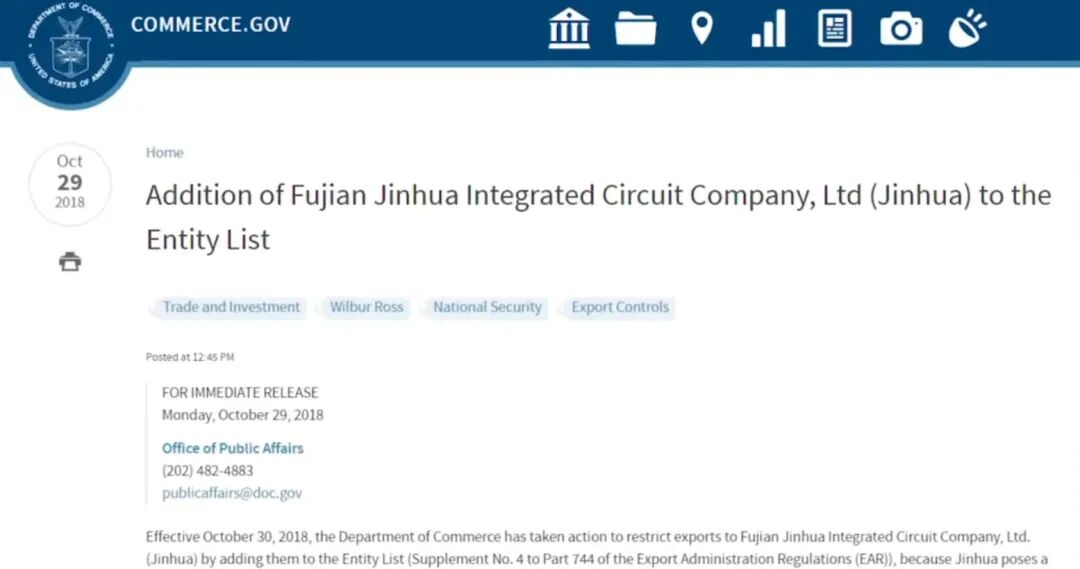 2018年10月29号,美国商务部将福建晋华列入出口管制清单,宣称:“福建晋华即将增加DRAM的大量生产能力。这些即将增加的生产能力,有可能是根据来自美国的技术,威胁到了美国军事系统基本供应商的长期经济生存能力” 。