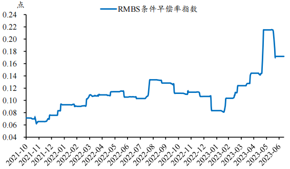 RMBS条件早偿率指数,表示提前偿付债务的金额占资产池未偿本金余额的占比。看上图发现,6 月以来居民提前还贷意愿依然偏强,尽管当月下旬RMBS条件早偿率指数有所降温,但仍处于0.17点的相对高位。