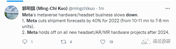 翻译过来就是,元宇宙总舵主,Meta(原来的Facebook) 将 2022 年 VR 头显的出货目标从 1000-1100 万下修至 700-800 万,并搁置了所有的 2024 年后的项目。可见消费电子在美国有多差。