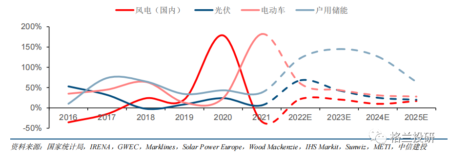 大家看这张图就好了,从当下新增复合增速的排序看,光伏在2021-2025装机的复合增速在38%,电动车的电池装机复合增速约40%,而风电的新增装机复合增速在17%。