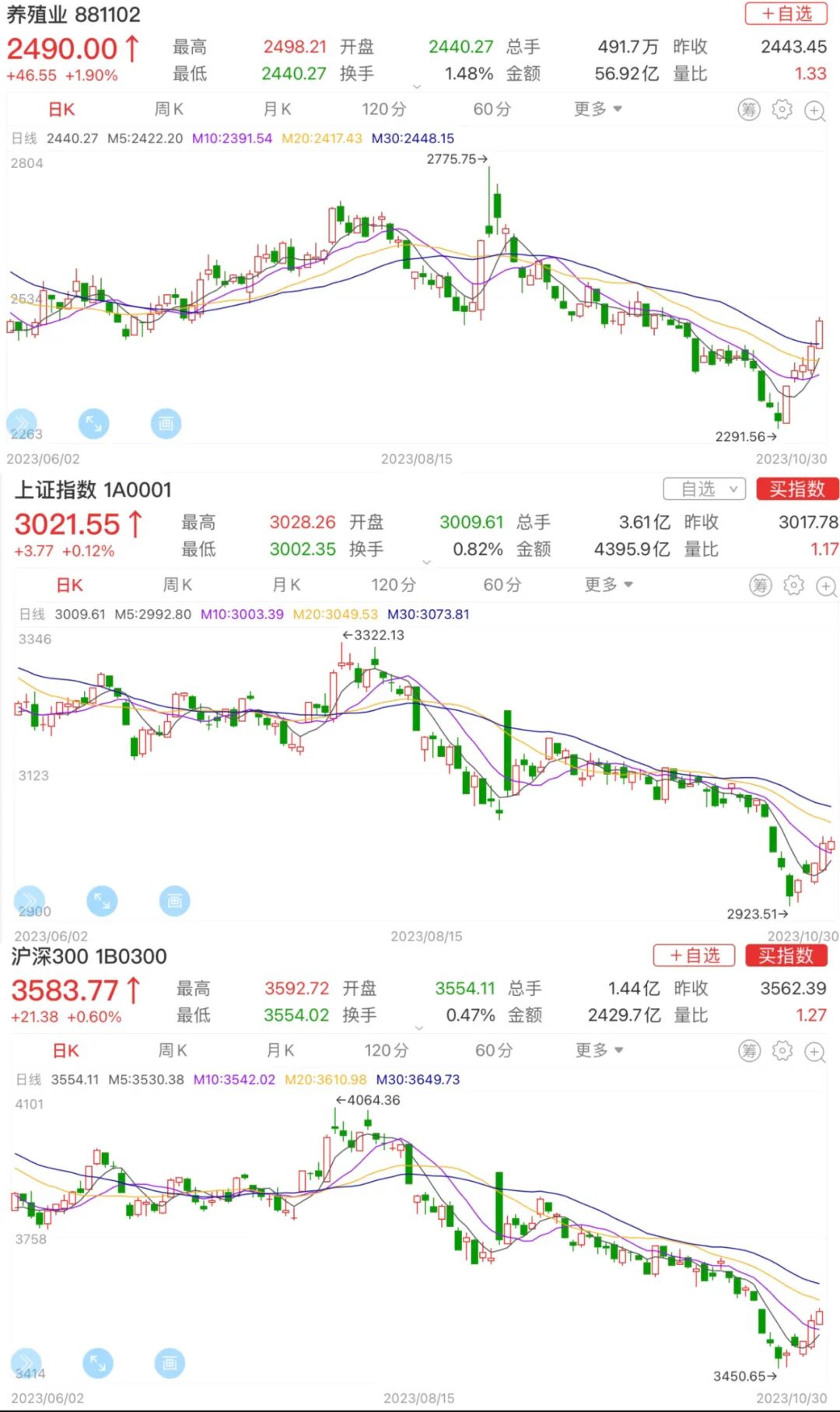 技术层面上,能发现养殖业和上证指数的走势很相似,与沪深300的走势更相同。