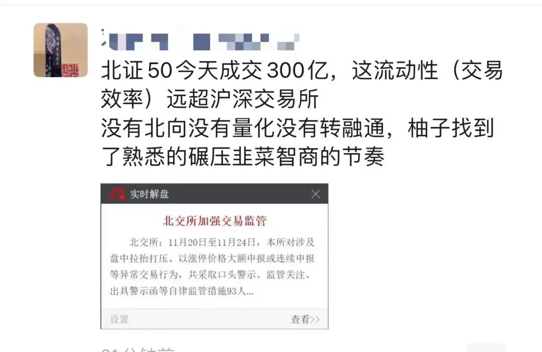 北交所今天还是很火的,指数上,北证50并没有一路摸顶,盘中跳了一下水,因为北交所发布消息对一场交易和个股采取“口头警示”和“重点监控”,力度还不及对短剧的监管,估计是突然场子热了,监管之前也没啥经验。