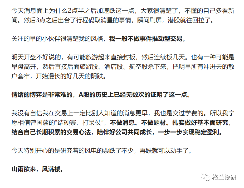 今天不知道看到了今天旅游股的暴跌,酒店餐饮、航空、旅游个股普遍跌停。有没有回想起前天在《山雨欲来,风满楼》里我写的文字。