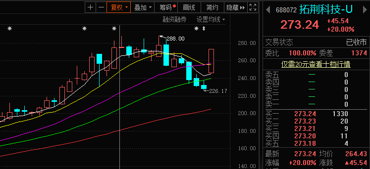 拓荆科技在顶部盘整以后,持续下跌,只有前期的一个平台作为支撑。这里基本上如果你仓位很重,而又对基本面没有深度认知的话,一定是拿不住的,而在这个时候,出来的中报非常靓丽,超预期兑现业绩,直接资金就选择了打20CM涨停。
