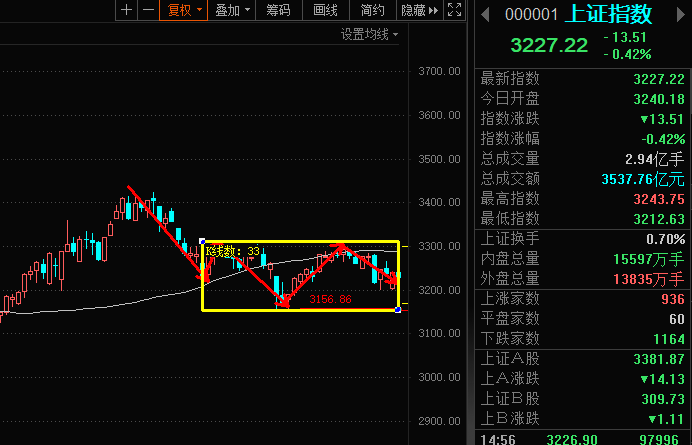 从日线上,我们可以简单看出,大盘目前在3156到3300这个地方震荡,用了30多个交易日,始终没走出这个中枢。这是一个标准的平台中枢,对比这一笔下跌和前一笔,目前出现了轻微的背驰,只要这个地方不要跌破前头3163的前低,就可以做缠论中所谓第二类买点,但是我认为这个危险性很高。