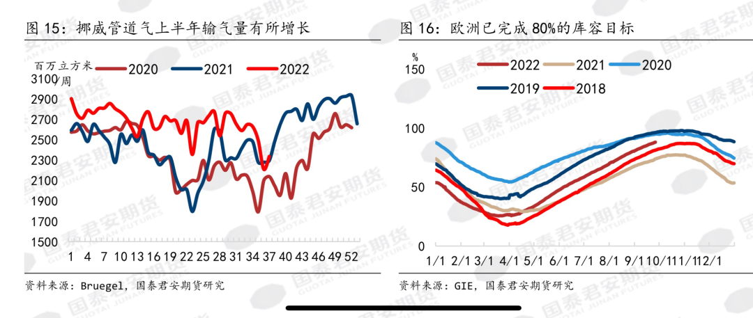 挪威管道气以及液化天然气的进口增量也使得即使在俄气下滑的情况下,欧洲提前完成了其补库目标。最新数据还没出来,预计按照当前的补库速度,我算了一下,到10月1号就可以储满90%了。