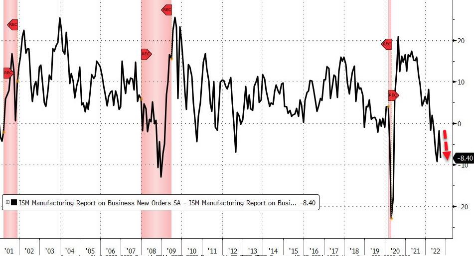 指数的一个重要分项,新订单指数环比下降4.2个百分点至47.1,这个水平是新冠疫情爆发初期的水平,这已经跌入收缩区间,显示出美国制造业需求迅速减弱,说明制造业企业接不到新订单了,而且库存还在上升。