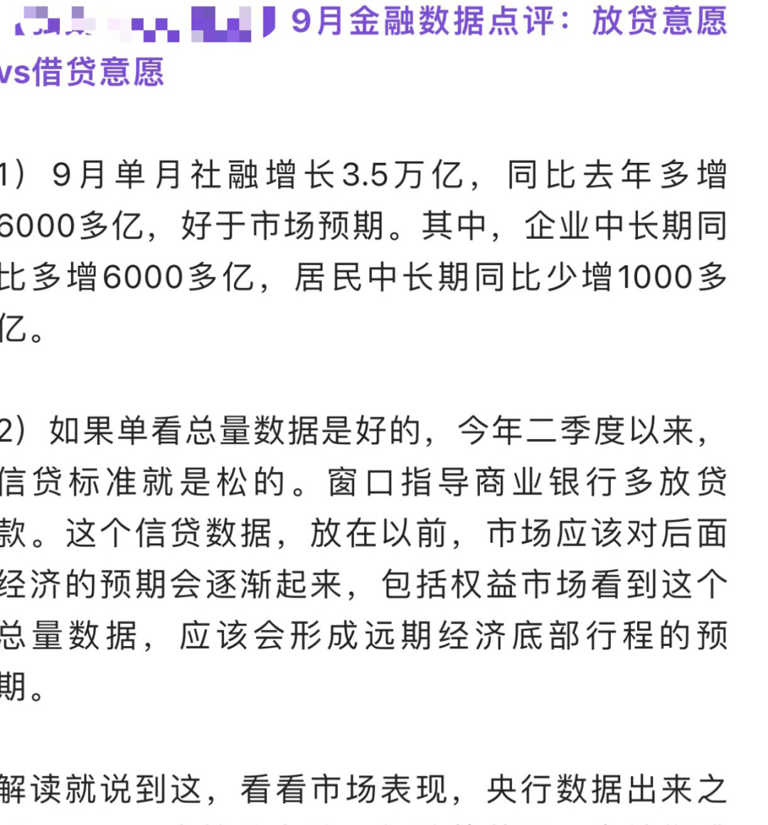 9月金融数据点评:放贷意愿vs借贷意愿1)9月单月社融增长3.5万亿,同比去年多增6000多亿,好于市场预期。其中,企业中长期同比多增6000多亿,居民中长期同比少增1000多亿。2)如果单看总量数据是好的,今年二季度以来,信贷标准就是松的。窗口指导商业银行多放贷款。还是那个问题,这个信贷数据,放在以前,市场应该对后面经济的预期会逐渐起来,包括权益市场看到这个总量数据,应该会形成远期经济底部行程的预期。但今年目前的环境,让市场更加关注信贷结构,因为市场担心信贷的改善,不是居民企业主动的借贷形成的,而是政策指导的被动放贷(国央企)。3)市场上述担心的原因,一是居民中长期迟迟无法同比转正,二是历史过往周期,往往是居民中长期早于企业中长期出现改善,而不是现在这样企业早于居民。所以,目前的信贷投放,到底是主动借贷,还是被动放贷,市场比较犹豫和怀疑。4)另外,市场在目前总量信贷数据不错的情况下,比较犹豫的另外一个原因是,疫情管控下,发放的信贷无法有效周转。因为以往信贷周转的主要引擎是地产,而目前的社融单月增长和地产销售数据看起来并不匹配。后面市场如果对经济和社融的理解发生预期改变,最重要的线索是地产销售状态的改变。