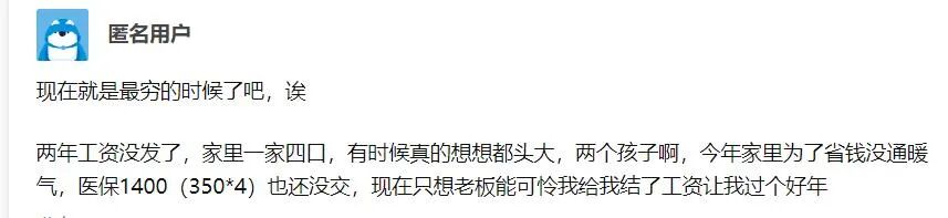 有人工资已停发,有人已失业,断了收入的日子可想而知,下面还有孩子要养,为了省钱,入冬的暖气费都停掉了,医保也没交上,这样的境地,又有多少人群雷同呢?