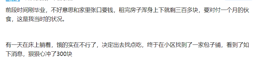 有人没钱硬撑着,不好意思和家里要钱,三百多块要应付一个月的生计,直到看见正好有家包子铺包月优惠活动。。。