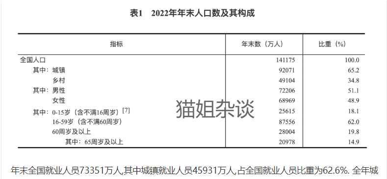 世界人口网2023.11月份公布的数据显示,全国就业人数为7.3351亿人,和之前7.76亿人就业人数相较,略有下滑。60岁及以上共计2.8004亿,加上46-55合2.35超5亿人在退休年龄段。