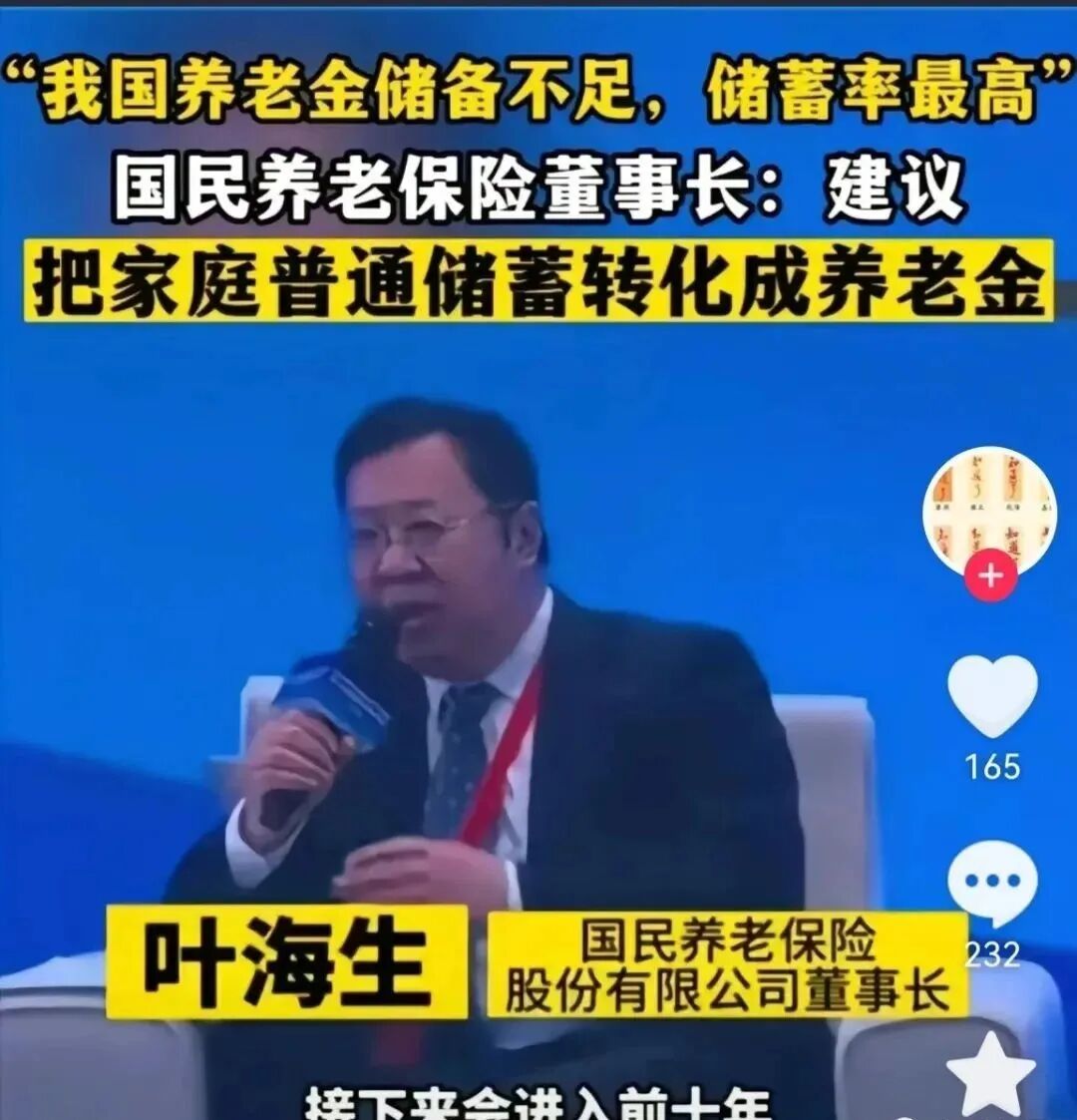 这个叶海生啊,认为老百姓太有钱了,存在银行不花,是可忍孰不可忍,应该拿出来为养老做出贡献,将储蓄纳入到养老金。