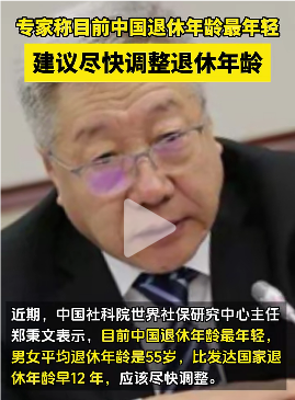 目前中国退休年龄最年轻,男女平均退休年龄是55 岁,比发达国家退休年龄早12 年,应该尽快调整。