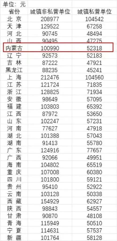 拿内蒙举例,体制内平均年入过10万,体制外仅为52318,意味着每月收入仅为4360。