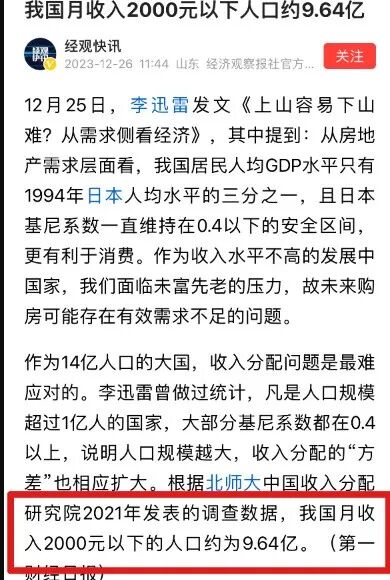 何况,有多少人连这个平均收入都达不到,毕竟官方公布还有9.64亿人月收入2000以下,月入3000的中等收入有4亿人。