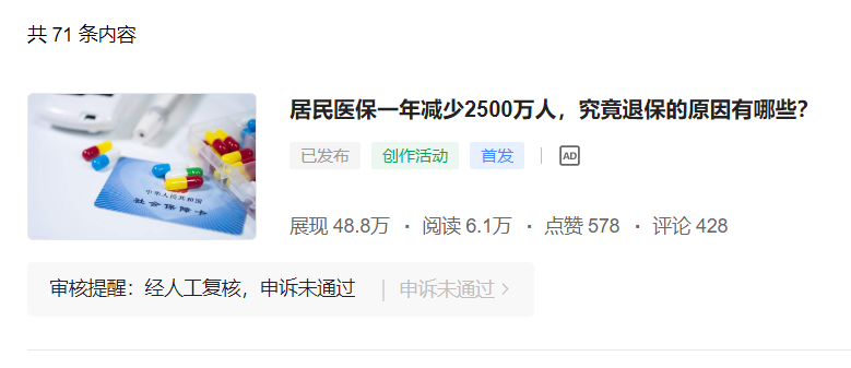 文章写了有关社保断缴的一些官方数据以及个人分析,标题也是官方原标题。但是,头条审核居然没过,理由标题夸张.....等同于判定官方文章标题夸张,这逻辑有无问题?