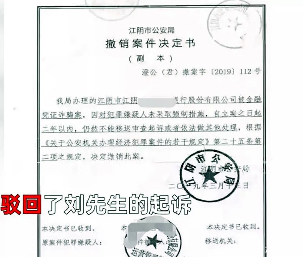 目前的情况就是,刘先生妻子的“金融凭证诈骗案”已被警方撤案,当然这不代表存单就一定是真的,只能说明刘先生和其妻子没有伪造金融凭证的嫌疑。而刘先生也再次向无锡市检察院提起抗诉申请,无锡市检察院已受理。