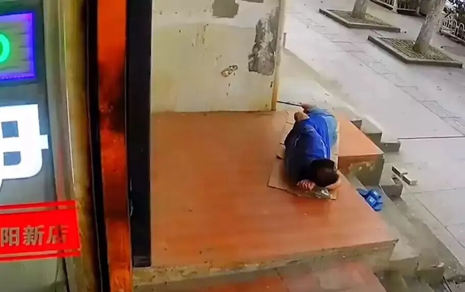 近日,湖北黄石阳新网友就分享了一则令人感到暖心的监控画面。视频显示,在一家广告店前,有一位民工大叔工作完后躺在店门口的地上休息,地上只有一张薄薄的纸皮。店主从外面回来后,看见躺在地上的大叔,就热情邀请他进店里面休息。