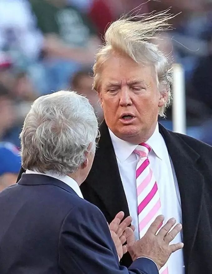 2012 年 10 月 21 日,唐纳德·特朗普在吉列体育场对阵纽约喷气机队的 NFL 比赛前与爱国者队老板罗伯特·克拉夫特交谈。可以看到他的前额头发被风吹起。