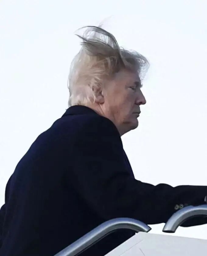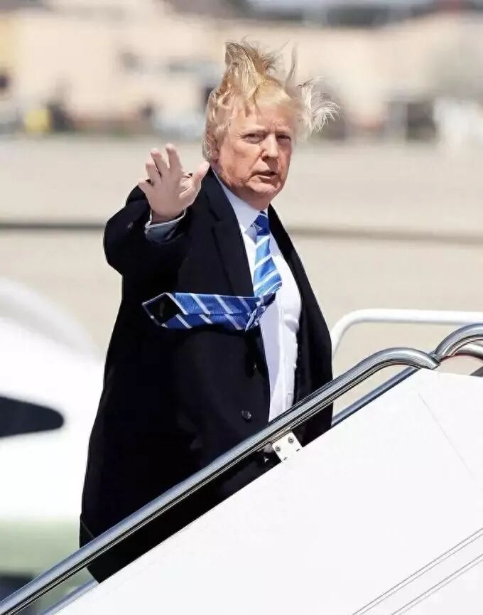 唐纳德·特朗普在马里兰州安德鲁斯空军基地登上空军一号前往棕榈滩国际机场时,头发飞扬。这张照片引起了社交媒体用户的许多回应。