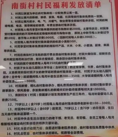 在南街村的村委会墙上,悬挂着这样一幅村民福利分配的清单,大家来看看吧!