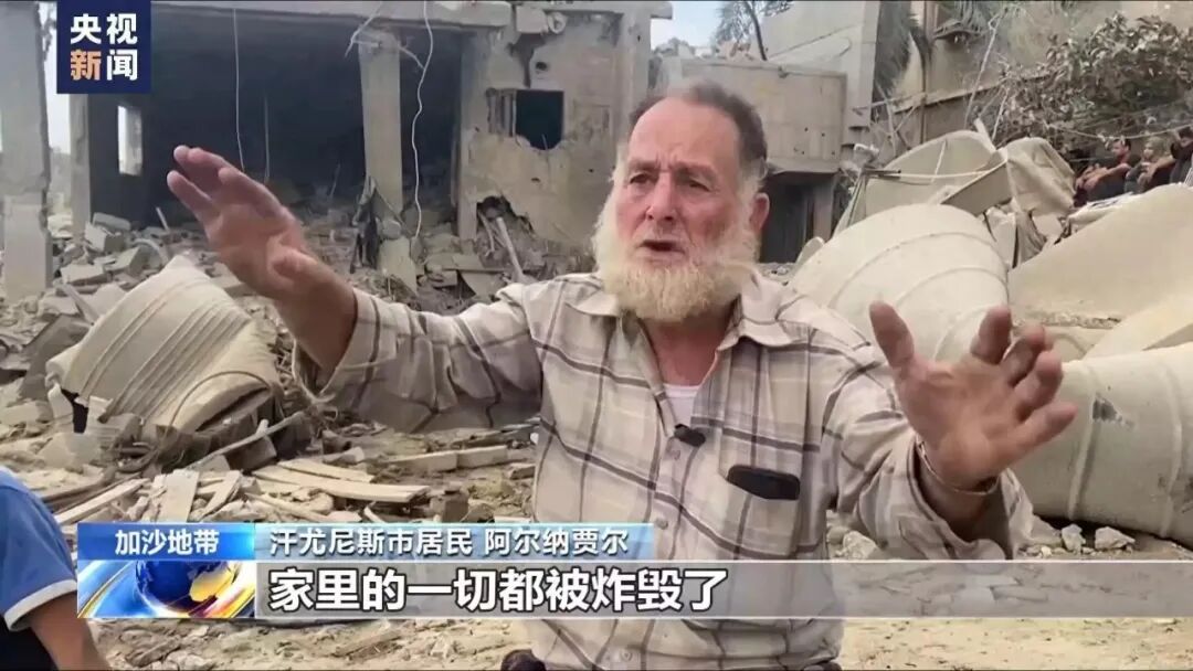 汗尤尼斯市居民 阿尔纳贾尔:我当时牵着马,看到以军飞机来了,我就让马停了下来。飞机发射了一条带状的物体,然后炮弹就像雨点般落了下来,到处都是爆炸,它们不是细长条,而是桶状的炸弹,所以我能看见它们。我有两个女儿和一个儿子,家里的一切都被炸毁了,什么也没留下。