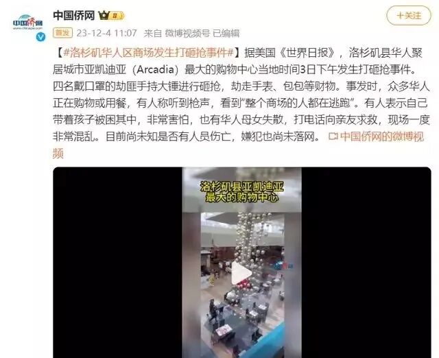 据中国侨网援引美国《世界日报》报道,当天下午,四名戴口罩的劫匪手持大锤闯入购物中心,疯狂砸抢财物,,包括手表和包包等,引发了惊魂一刻。
