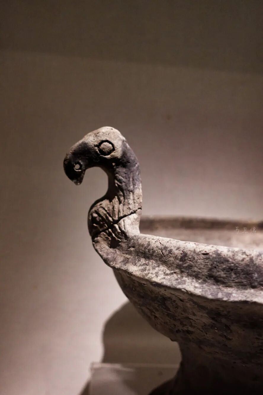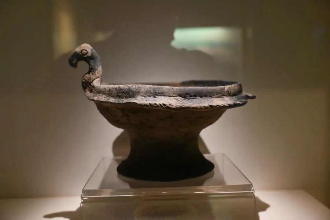 在牙雕鹰首的旁边还藏着另一款以鸟为原型的文物--鹰形陶豆,出土于傅家山遗址。可以看得出来整个文物头尾分别塑造了鹰头和鹰尾的造型,两边分别设计了一只翅膀,造型精美,同样是新石器时期不可多得的珍贵遗存。