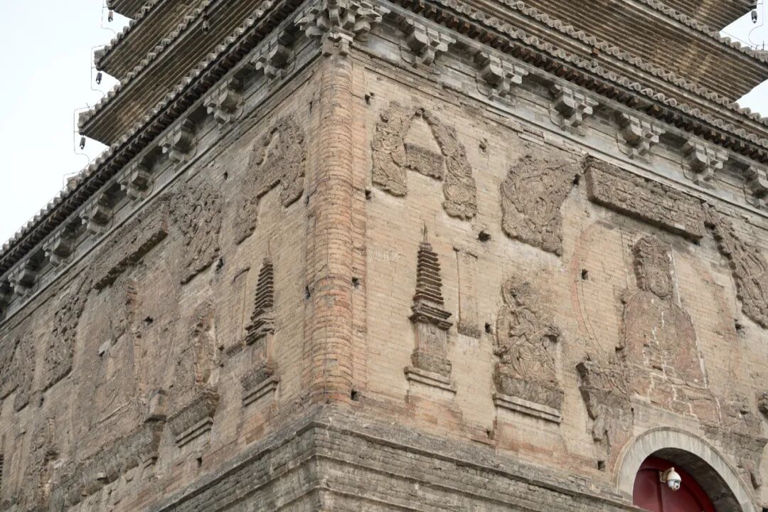 除了高度辉煌之后,整个古塔的雕刻工艺同样非常精美,那一尊尊坐佛、菩萨、化生童子、伎乐人、莲花等浅浮雕可谓是展示了辽代雕刻工艺的精湛。