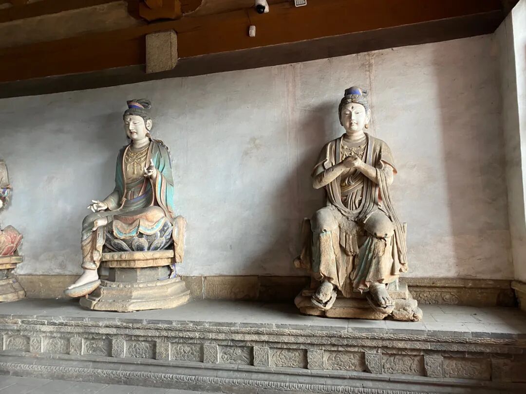 圆觉殿内的菩萨虽为宋代彩塑但却带着浓浓的唐代风格,12尊菩萨呈现出宋代女性的面貌,脸颊丰满、眉毛长而弯曲、身上穿长裙、披帛,用缨络作为配饰,这些衣服和璎珞虽色彩艳丽但丝毫不俗气。这些菩萨或微微上举双手、或一手抚膝一手作拈花状一手抚膝一手作拈花状或双手合十置于胸前......优美的体态和神韵让她们成为了法兴寺中的一绝。