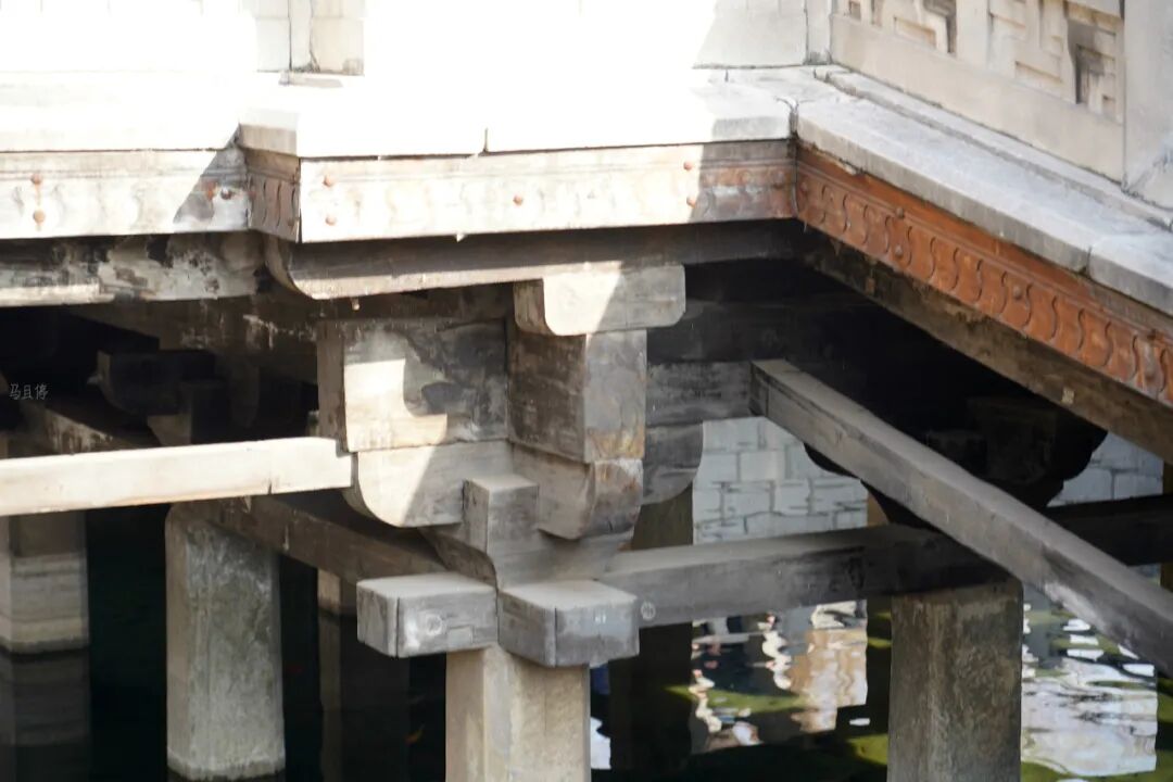 古人将圆者为池,方者为沼。晋祠的这方池水为方形,因此被称为沼;沼内立有34根小八角形的石柱柱顶架斗拱和枕梁,承托着十字形桥面,这便是飞梁,故名鱼沼飞梁。很难想象,在800多年前古人就想到用这种构思来建造桥,也能怪晋祠鱼沼飞梁是国内现存古桥梁中仅有的一例。