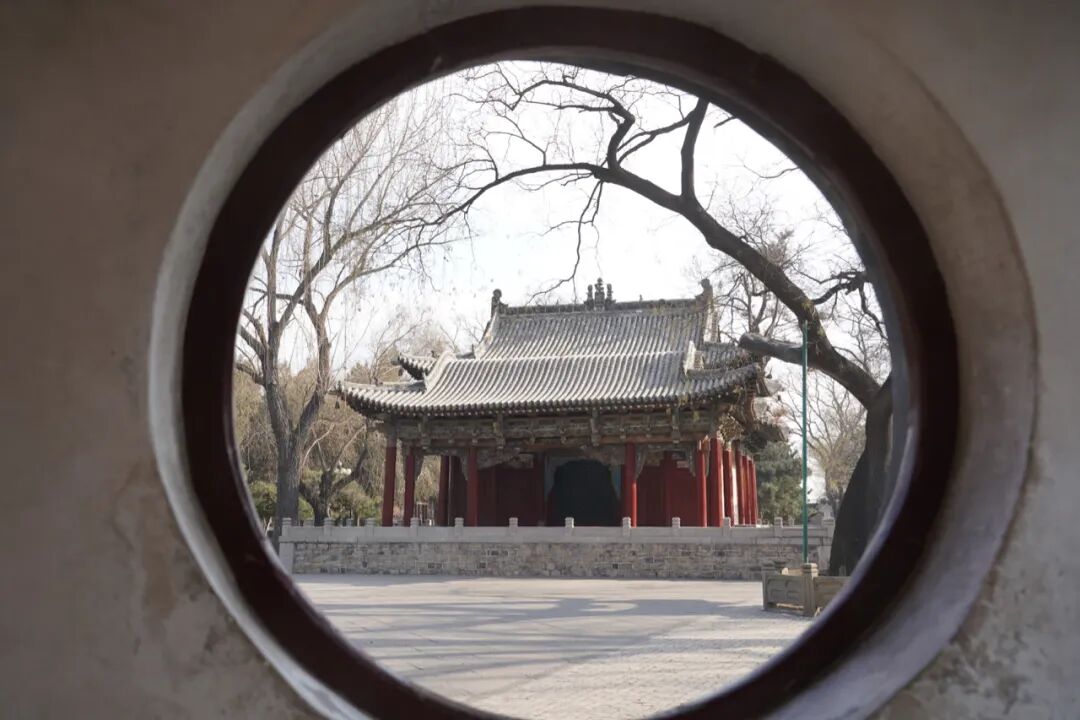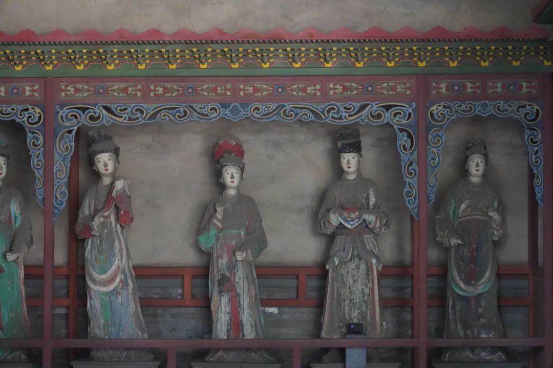 进入殿堂后,内部立有43尊宋代彩塑,主像圣母坐在木质的神龛中安放在中间,而圣母即为周武王之妻、姜太公之女邑姜。两侧的42个神龛分别列着仕仆,每一尊彩塑都神态各异,姿态迥异。不得不佩服曾经古人的智慧,这些彩塑从不同角度看神态不一,同一个面容可以呈现出喜和怒的两种神态,不愧是珍惜宝物。