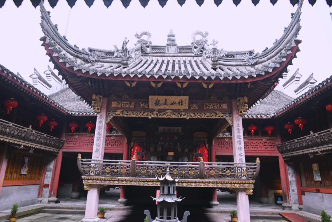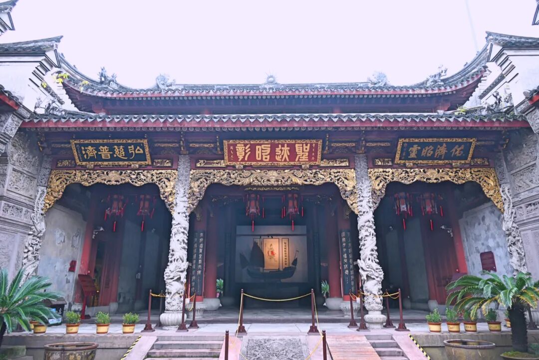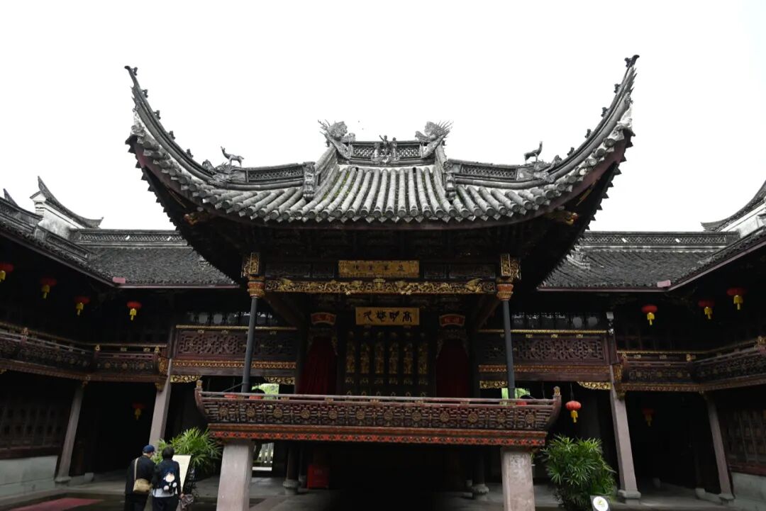 庆安会馆清咸丰三年,为一座供奉祭祀天后妈祖的殿堂,同时它也是行业社交之地。现存建筑面积达3900平方米,包含了宫门、前殿(连戏台)、大殿(连戏台)、后殿、左右厢房等建筑,重点关注两座连戏台,采用了宁波传统的朱金木雕砖雕和石雕的建筑装饰手法,远远望过去金碧辉煌。