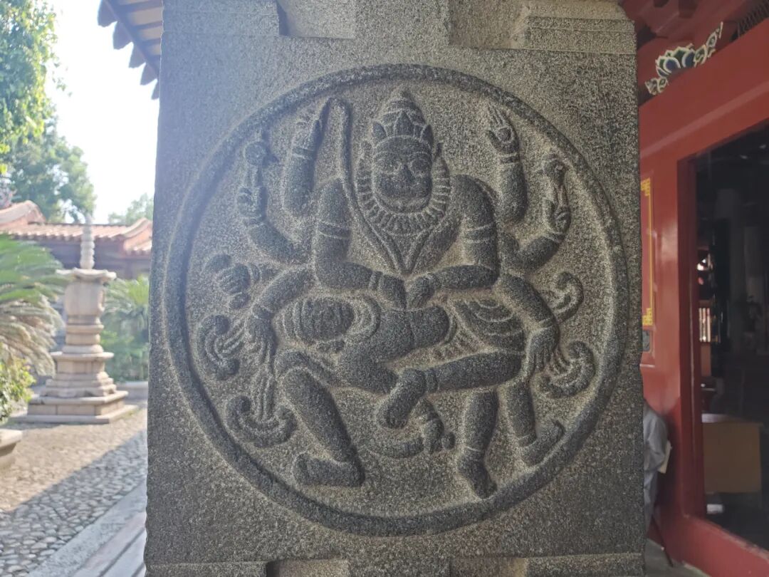 首先殿堂前侧月台的须弥座处可以看到精美的狮身人面青石浮雕以及在殿堂后廊两根石柱上也可以看到婆罗门教的浮雕图案,据考证,这些浮雕图案均是从泉州曾经的元代古印度教寺院迁移而来,它也见证了泉州宗教多元的特色。