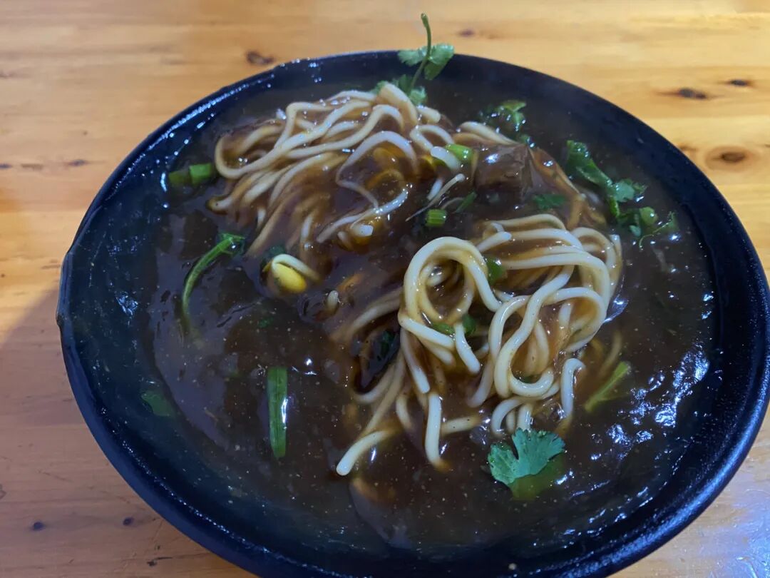 阆中有美食四怪,那就是凉面热着卖,馒头盖章卖,醋当饮料卖,牛肉熏黑卖。首先就要来尝尝这个凉面制作的阆中牛肉面,煮好的面晾凉吃起来更劲道,然后加上用牛肉制作的热臊子,牛肉吃起来酥软且又嚼劲。