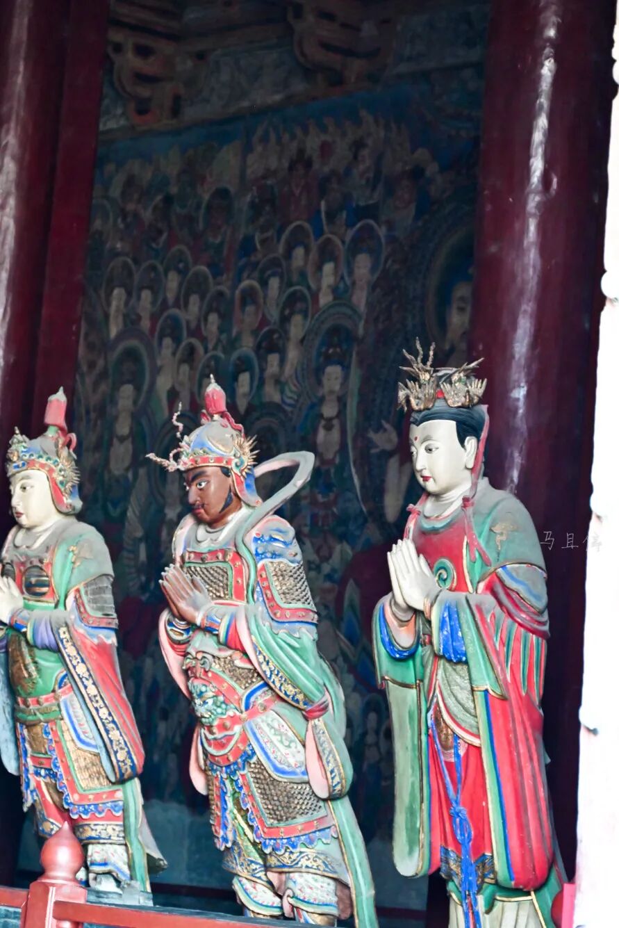 大雄宝殿的内部非常高大,柱子相比一般的庙宇会少一些,因此看起来更为宽敞,殿内拥有20多座塑像,其中可以重点关注中间3尊为木质金身佛像,殿堂四周的壁画也都是清代的,也可以关注一下。