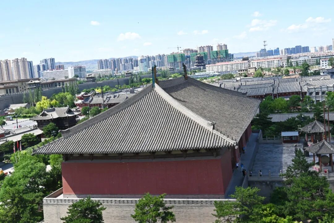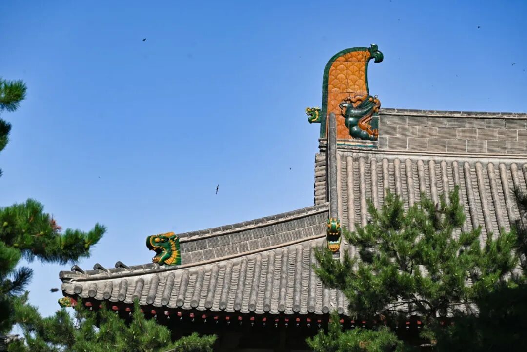 走出大殿内,可以站在钟鼓楼中间往大雄宝殿的顶部看,在两侧有两个黄绿琉璃釉鸱吻,这样的造型可是中国古建筑中最高等级的模式,一般只有皇家才可以拥有。北侧的为金代原物,另一侧则是明代仿造的。