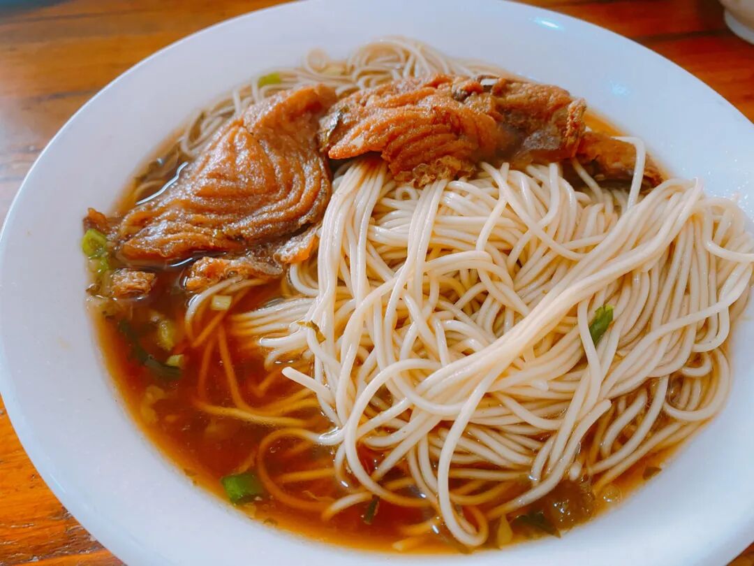 我个人更青睐于当地最特色的小吃--双交面,所谓的双交面也就是盖头为酥肉和酥鱼的双浇头,酥肉肥而不腻、酥鱼外脆里酥,配上雪菜、葱段、汤汁,咸中带甜品尝起来很有江南的风情。