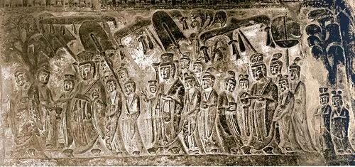 在郑州巩义石窟的3个佛窟中可以看到礼佛图,分别被藏在第一、三、四窟中。在第一窟中我们可以看到两组礼佛图,分别位于南端东西两旁的石壁之上,每一侧的礼佛图分成了3层。在东边的一侧为皇帝居中的男供养礼佛图,另一侧就是以皇后居中的女供养礼佛图。