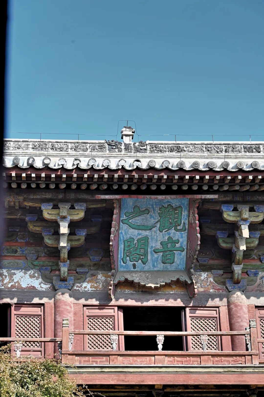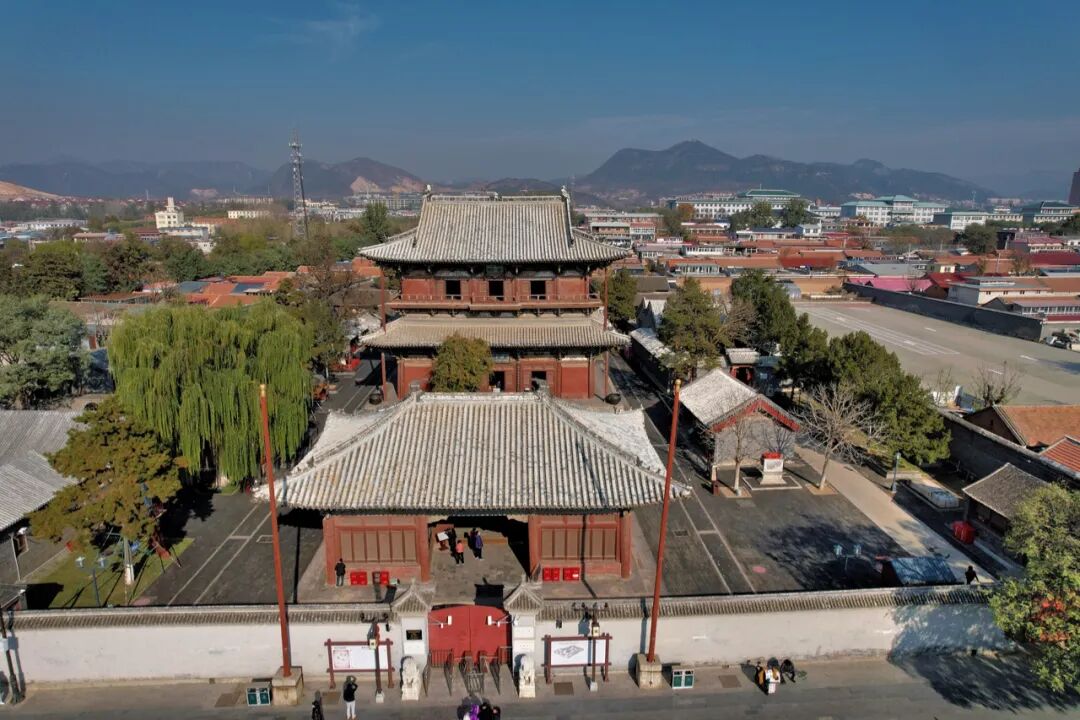 其一看山门:独乐寺山门是我国现存最早的庑殿顶山门,为一座面阔三间进深两间的建筑,顶部鸱吻为辽代原物。