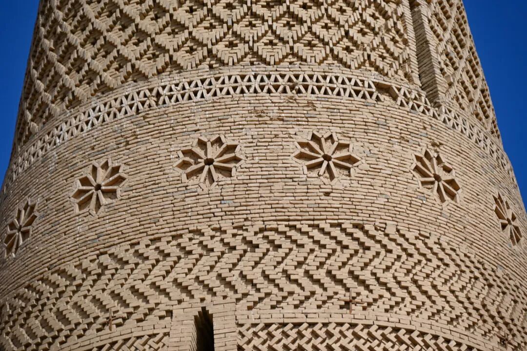 因为有这些交错复杂的几何图案存在,让苏公塔的古塔看起来就多了几分层次之美。旅行者不妨移步到古塔之下,站在这里抬头看,那组合起来的几何图案甚是精美。