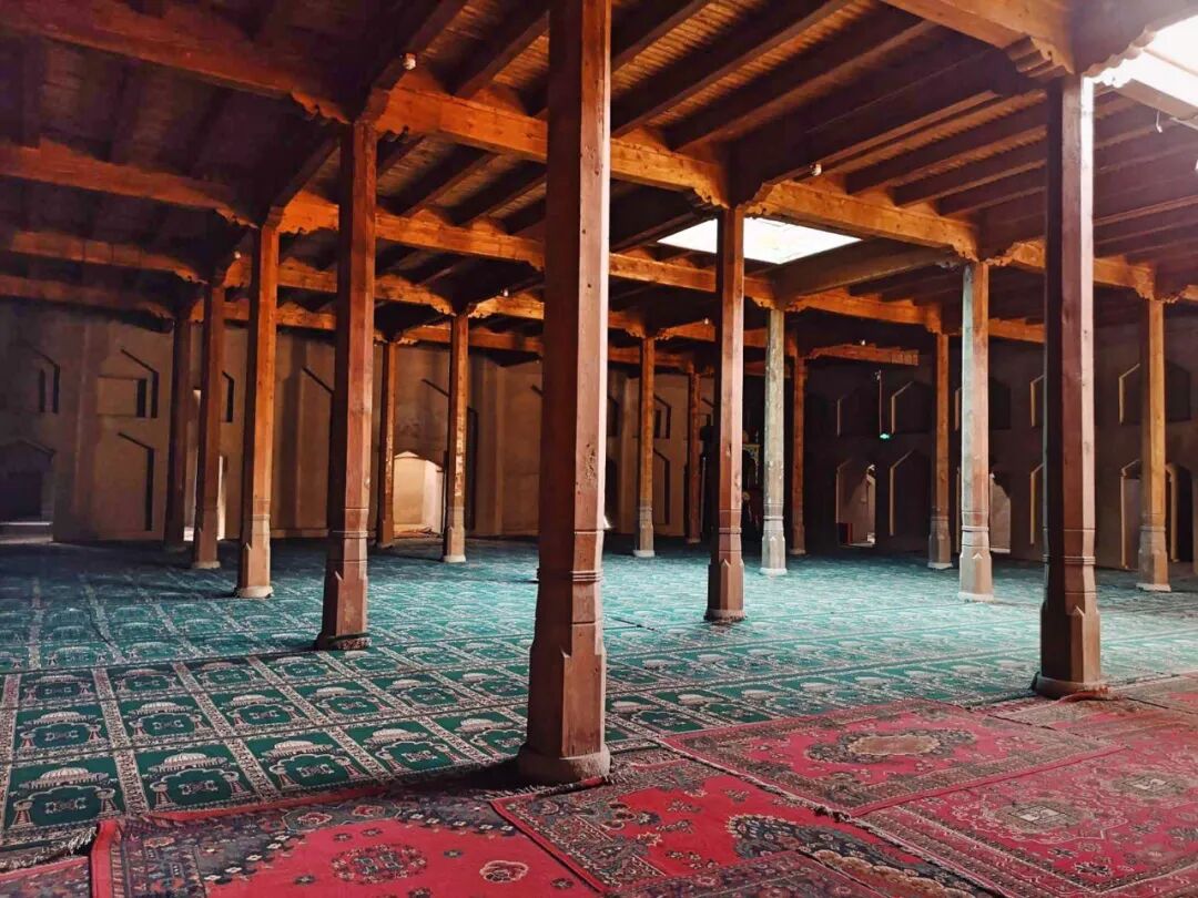 不过苏公塔的精美之处都在内部,穿过门楼之后,我们可以看到大厅内有不少异域风情的装饰物, 比如清真寺中典型的穹顶、雕花木柱子、中亚风格的马蹄形券顶等,这些装饰都让苏公塔看起来多了几分华丽之美。