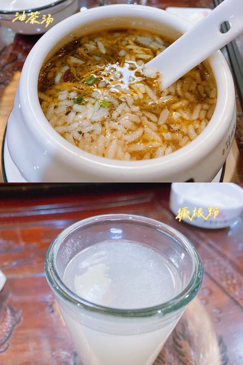 所谓的油茶汤就是用茶叶、姜、花椒加入水中煮沸,然后将汤水倒入装有炒炸好的黄豆、豆腐、果仁、花生米的碗中,就可以使用。油茶汤的口感香、脆、滑,第一口品尝到就很特色。